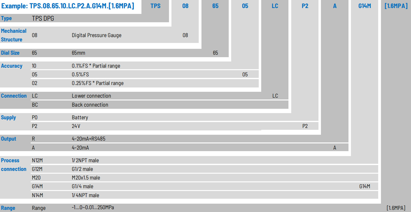 The TPS.08 series digital pressure gauge is a device that can accurately and realtime display pressure, with features such as low power consumption and good longterm stability. It is equipped with an LCD display screen and has multiple functions such as reset, backlight, power on/off, unit switching, and low voltage alarm. It is easy to operate and install. The product adopts a stainless steel 304 shell and joint, which has good vibrational resistance and can measure non corrosive media such as gas, liquid, oil, etc. It is used in portable pressure measurement, automation equipmentmatching, pressure vessel and other measurementfields.